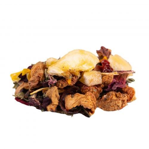 Ingrédients: Pomme*, hibiscus*, cynorrhodon*, mélisse*, écorces d'orange*, banane (banane, huile de noix de coco, sucre de canne, miel)*, arôme naturel d'orange, fleurs de souci*, arôme naturel de mangue, mangue*. *Issu de l‘agriculture biologique
