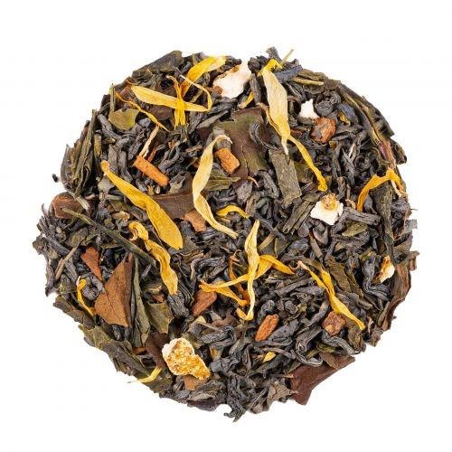 Ingrédients: Thé vert China Chun Mee*, thé vert China Sencha*, bâtons de cannelle*, thé blanc Pai Mu Tan*, écorces d'orange*, Huile essentielle de mandarine*, arôme naturel de cannelle, thé blanc Mao Feng*, fleurs de souci*, Huile essentielle de citron vert*. *Issu de l‘agriculture biologique
