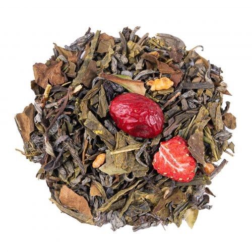 Ingrédients: Thé vert China Sencha*, thé vert China Chun Mee*, thé blanc Pai Mu Tan*, thé vert Darjeeling OP*, thé vert China Genmaicha*, arôme naturel de fraise, thé vert China Lung Ching*, canneberge*, fraise*, thé vert China Pi Lo Chun*, arôme naturel de canneberge. *Issu de l‘agriculture biologique