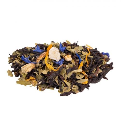 Ingrédients: Thé noir Assam*, -Inde du Sud*, maté vert*, gingembre (gingembre, sucre de canne brut)*, écorces de citron*, arôme naturel de citron, fleurs de souci*, arôme naturel de pamplemousse, fleurs de bleuet*, Huile essentielle de citron vert*. *Issu de l‘agriculture biologique