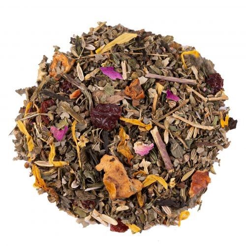 Ingrédients: Anis*, feuilles de mûre*, fenouil*, pomme*, cynorrhodon*, plantain lancéolé*, menthe poivrée*, feuilles de framboisier*, fleurs de sureau*, pétales de rose*, fleurs de souci*. *Issu de l‘agriculture biologique