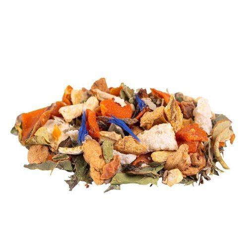 Ingrédients: Carotte*, gingembre*, écorces d'orange*, Rooibos naturel*, pomme*, feuilles de mûre*, gingembre (gingembre, sucre de canne brut)*, menthe poivrée*, verveine entière*, arôme naturel d'orange, passiflore*, arôme naturel de menthe poivrée, fleurs de bleuet*. *Issu de l‘agriculture biologique
