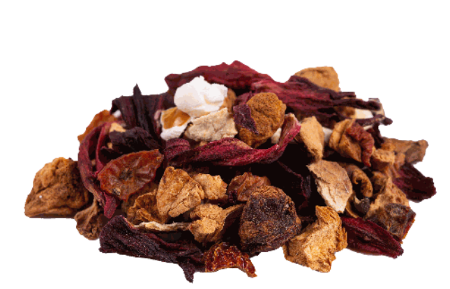 Ingrédients: Pomme*, hibiscus*, cynorrhodon*, écorces d'orange*, bâtons de cannelle*, gingembre (gingembre, sucre de canne brut)*, gingembre*, Huile essentielle de mandarine*, clou de girofle*, cardamome*, poivre noir*, NOIX*, pétales de rose*, pop-corn*, arôme naturel de cannelle. *Issu de l‘agriculture biologique