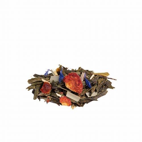 Ingrédients: Thé vert China Sencha*, citronnelle*, basilic* (8%), cynorrhodon*, fraise en poudre* (6%), fraise* (2%), fleurs de bleuet*. *Issu de l‘agriculture biologique