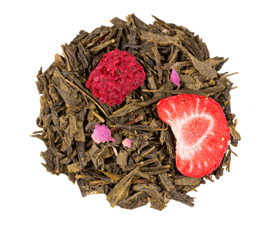Ingrédients: Thé vert China Sencha*, arôme naturel de fraise, China White Monkey*, fraise*, framboise*, arôme naturel de framboise, pétales de rose*, China Jasmin Dragon Pearls*. *Issu de l‘agriculture biologique