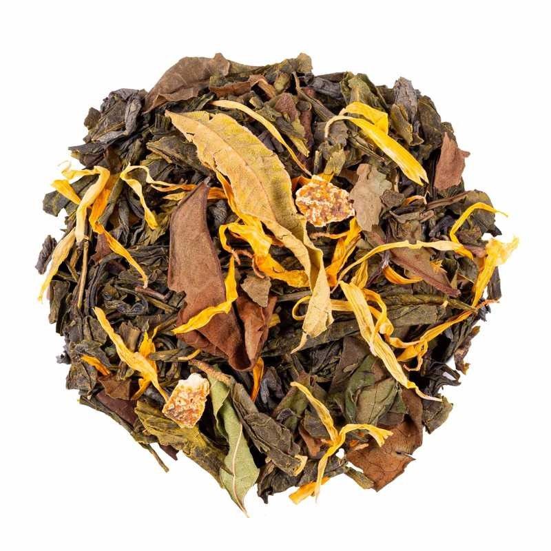 Ingrédients: Thé vert China Sencha, thé vert China Chun Mee, thé blanc Pai Mu Tan, thé vert Darjeeling OP, écorces d'orange, arôme naturel, arôme naturel d'orange, souci, verveine entière. Mélange premium élaboré avec des ingrédients issus de l'agriculture durable et des arômes naturels.