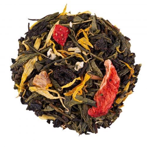 Ingrédients: Thé noir Assam*, -Inde du Sud*, thé vert China Sencha*, China Oolong*, morceaux de mangue*, griotte*, fleurs de souci*, fraise*, arôme naturel de fraise, arôme naturel de mangue, China Jasmin Dragon Pearls*, arôme naturel d'orange, ananas*, arôme naturel de bergamote. *Issu de l‘agriculture biologique