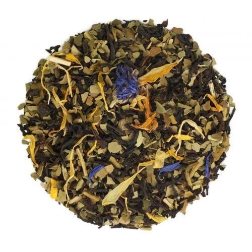 Ingrédients: Thé noir Assam*, -Inde du Sud*, maté vert*, gingembre (gingembre, sucre de canne brut)*, écorces de citron*, arôme naturel de citron, fleurs de souci*, arôme naturel de pamplemousse, fleurs de bleuet*, Huile essentielle de citron vert*. *Issu de l‘agriculture biologique