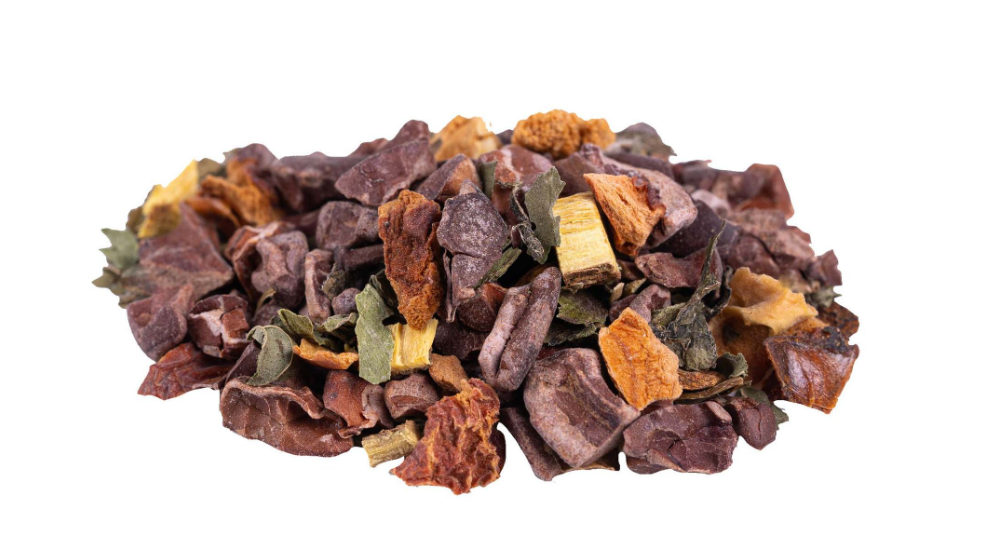 Ingrédients: Fève de cacao concassée*, pomme*, curcuma*, bâtons de cannelle*, menthe*, racine de réglisse*, menthe poivrée*, racine de chicorée*, extrait de cacao*. *Issu de l‘agriculture biologique